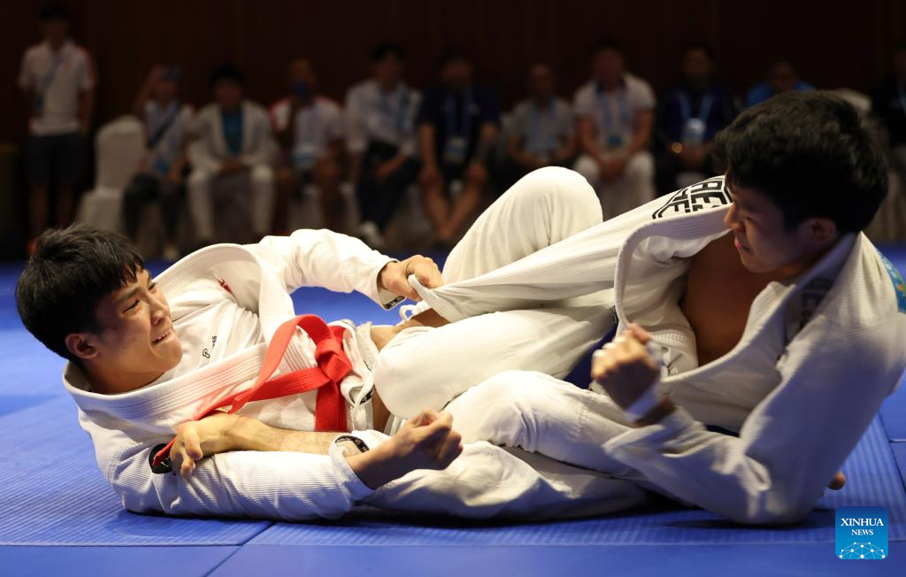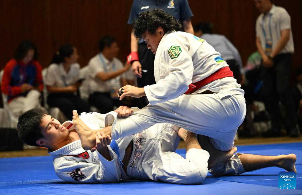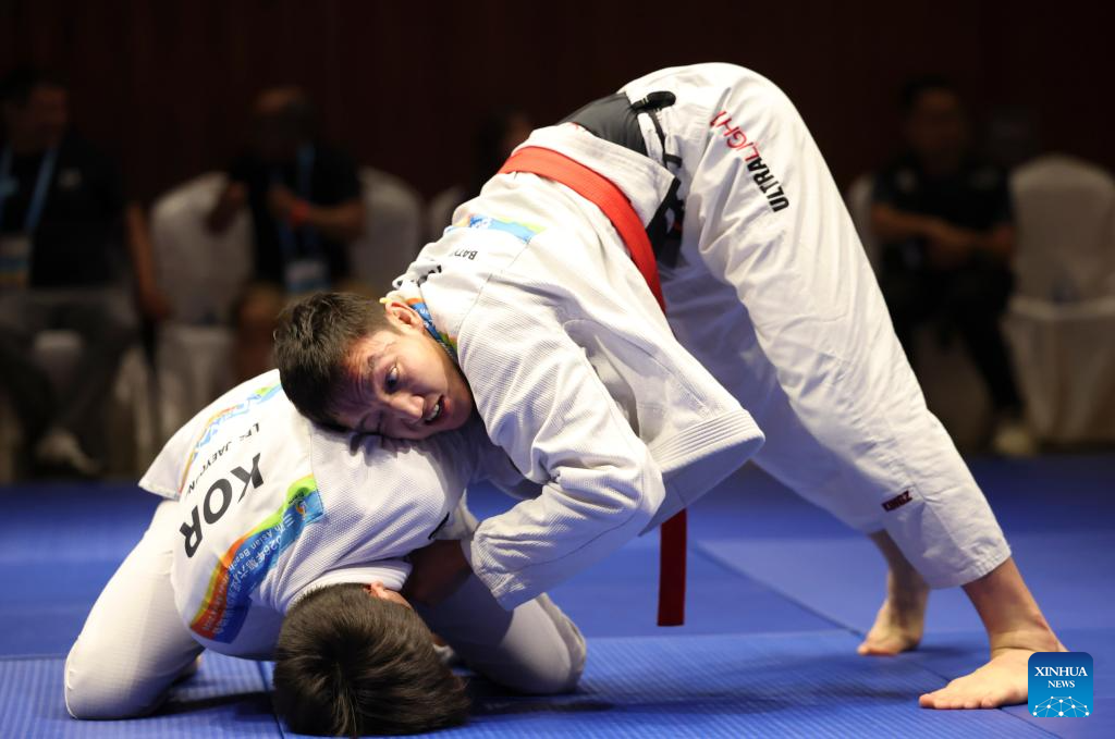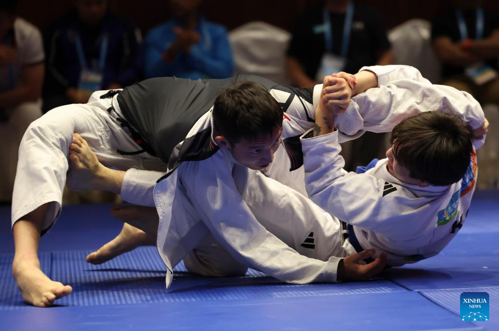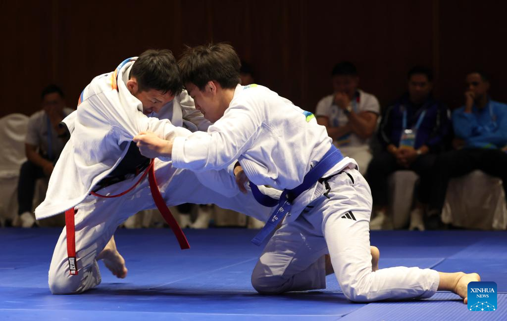 Nurzhan Batyrbekov (R) of Kazakhstan competes with Lee Jaeyoung of South Korea during their Jiu Jitsu men's -69kg contest for gold medal at the 6th Asian Beach Games in Sanya, south China's Hainan Province, April 24, 2026. (Photo by Ma Zihan/Xinhua)