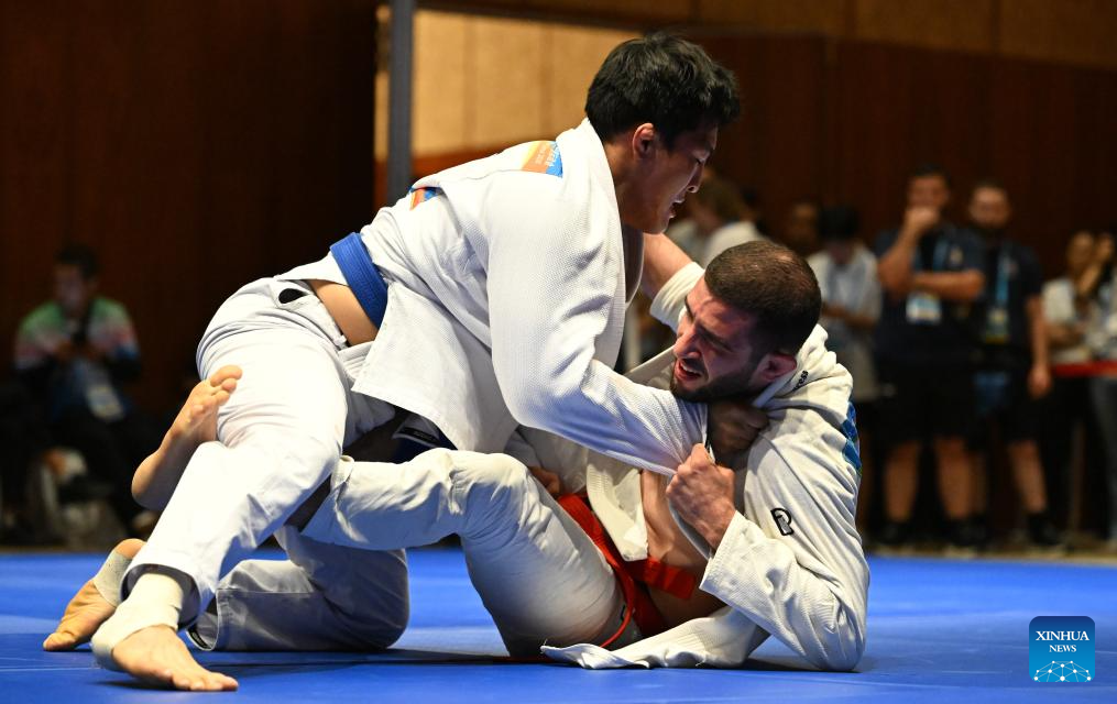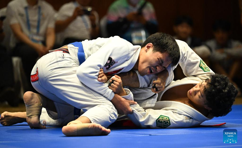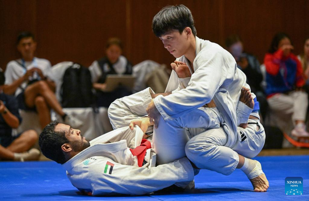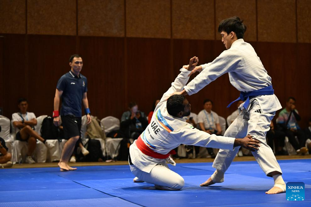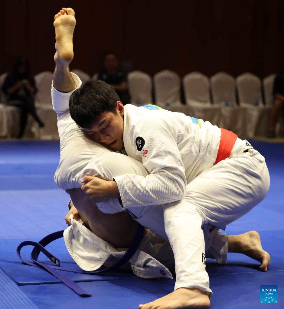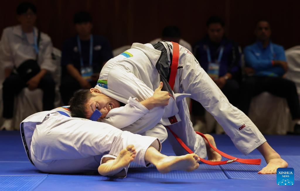 Park Jaewoon (L) of South Korea competes with Mahdi Alawlaqi of the United Arab Emirates during their Jiu Jitsu men's -77kg gold medal contest at the 6th Asian Beach Games in Sanya, south China's Hainan Province, April 24, 2026. (Xinhua/Bei He)