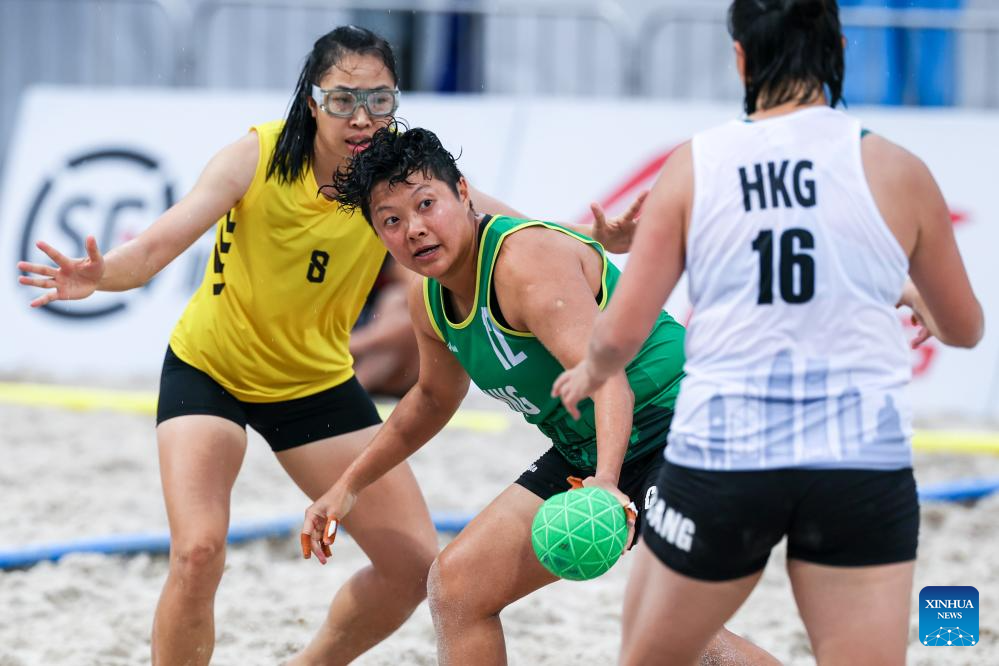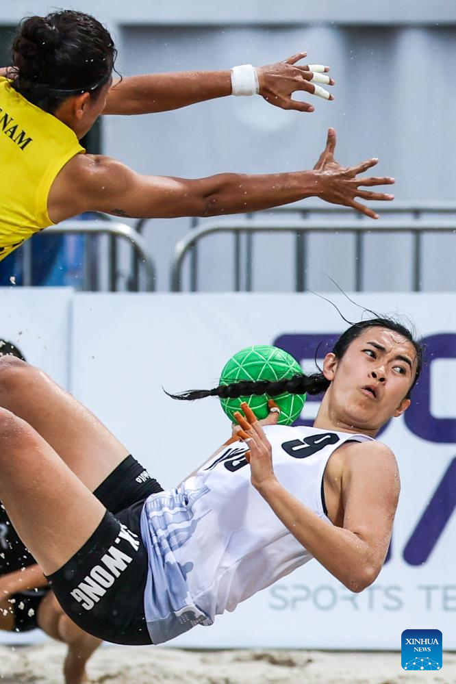 Chiu Chit Kwan (C) of China's Hong Kong competes during the beach handball women's preliminary round group A match between China's Hong Kong and Vietnam at the 6th Asian Beach Games in Sanya, south China's Hainan Province, April 24, 2026. (Xinhua/Li Bo)