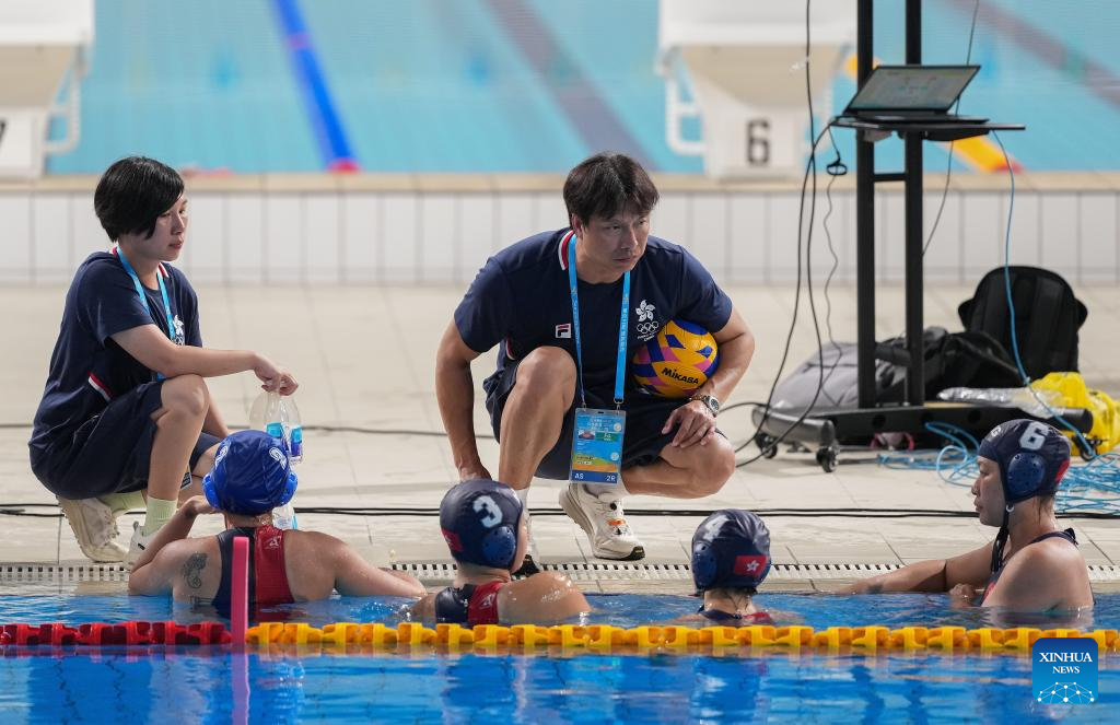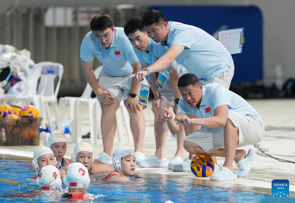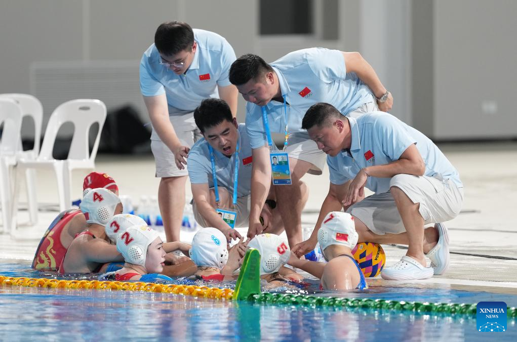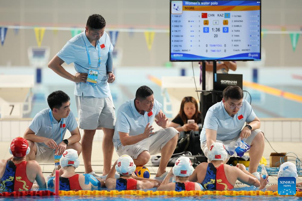 Wang Yang (2nd R), head coach of China, instructs players during the water polo women's round-robin final match between China and Kazakhstan at the 6th Asian Beach Games in Sanya, south China's Hainan Province, April 24, 2026. (Xinhua/Zhu Weixi)