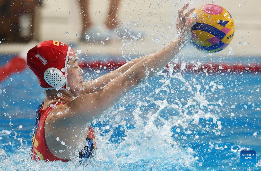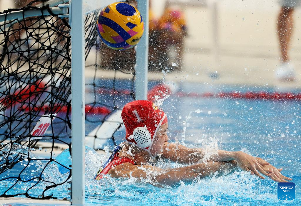 Yan Xintong of China makes a save during the water polo women's round-robin final match between China and Kazakhstan at the 6th Asian Beach Games in Sanya, south China's Hainan Province, April 24, 2026. (Xinhua/Zhu Weixi)
