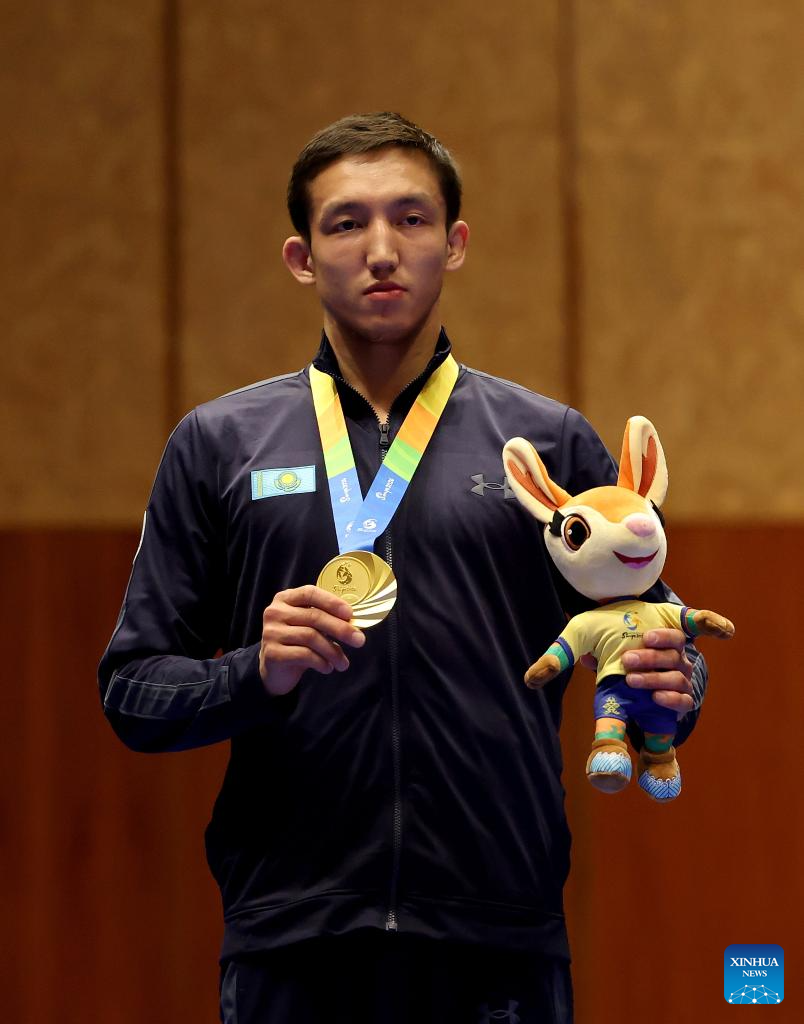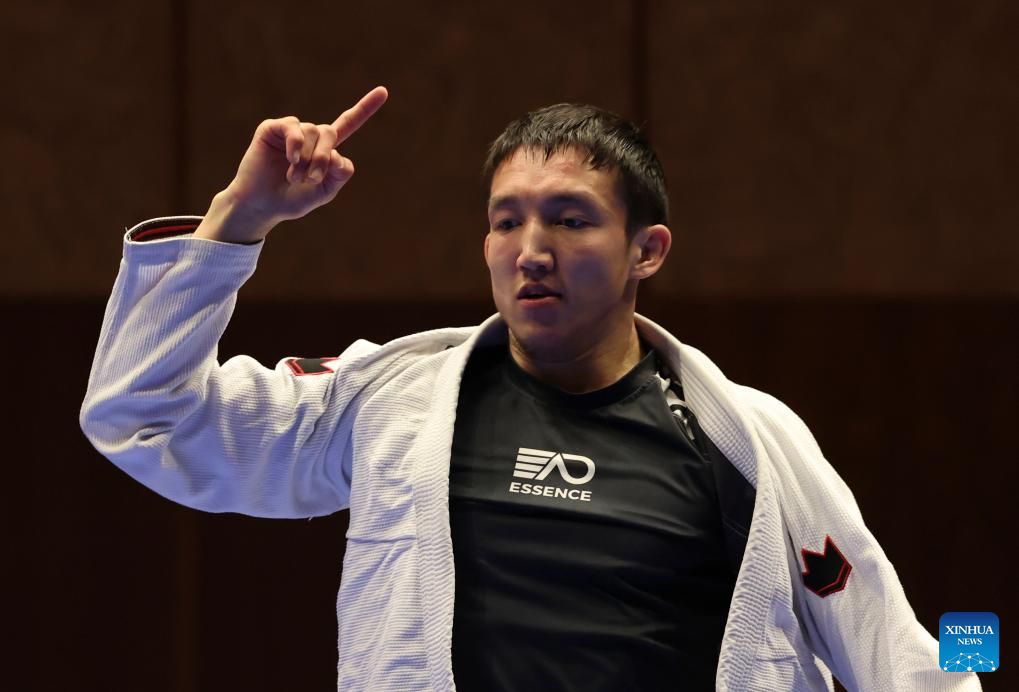 Gold medalist Nurzhan Batyrbekov of Kazakhstan poses for photos during the awarding ceremony for Jiu Jitsu men's -69kg at the 6th Asian Beach Games in Sanya, south China's Hainan Province, April 24, 2026. (Photo by Ma Zihan/Xinhua)
