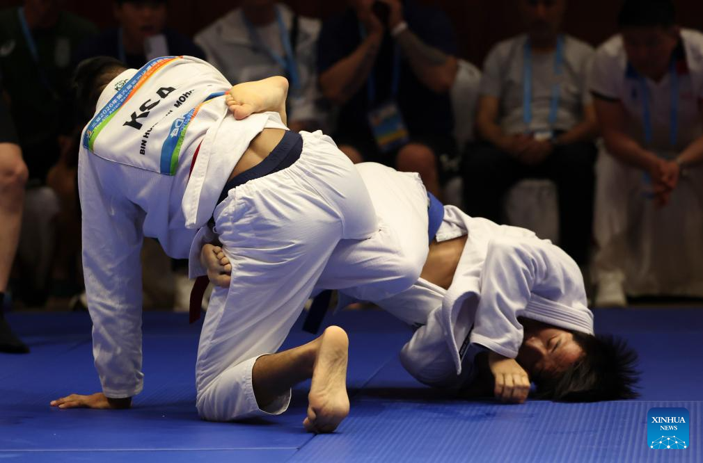Joo Seonghyeon (bottom) of South Korea competes with Mohammed bin Huraymil of Saudi Arabia during their Jiu Jitsu men's -69kg contest for bronze medal at the 6th Asian Beach Games in Sanya, south China's Hainan Province, April 24, 2026. (Photo by Ma Zihan/Xinhua)