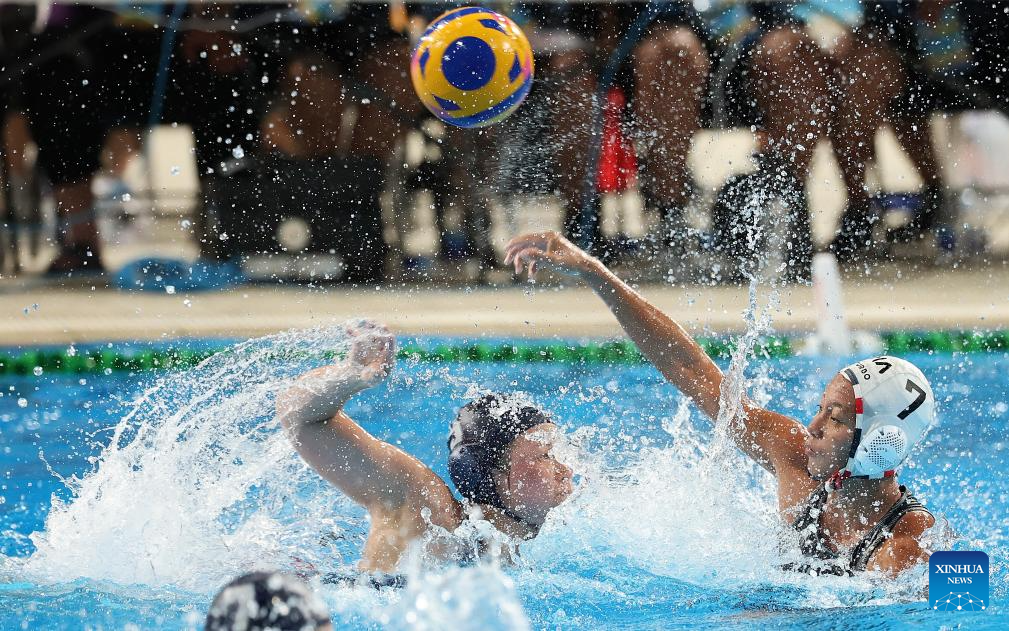 Aida Alpysbay (L) of Kazakhstan competes during the water polo women's round-robin final match between China and Kazakhstan at the 6th Asian Beach Games in Sanya, south China's Hainan Province, April 24, 2026. (Xinhua/Chen Sihan)