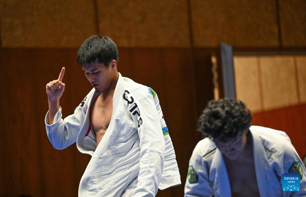 Seiilkhan Bolatbek (L) of Kazakhstan celebrates after defeating Lim Paul Tian Zhi of Sinapore during their Jiu Jitsu men's -77kg contest for bronze medal at the 6th Asian Beach Games in Sanya, south China's Hainan Province, April 24, 2026. (Xinhua/Bei He)