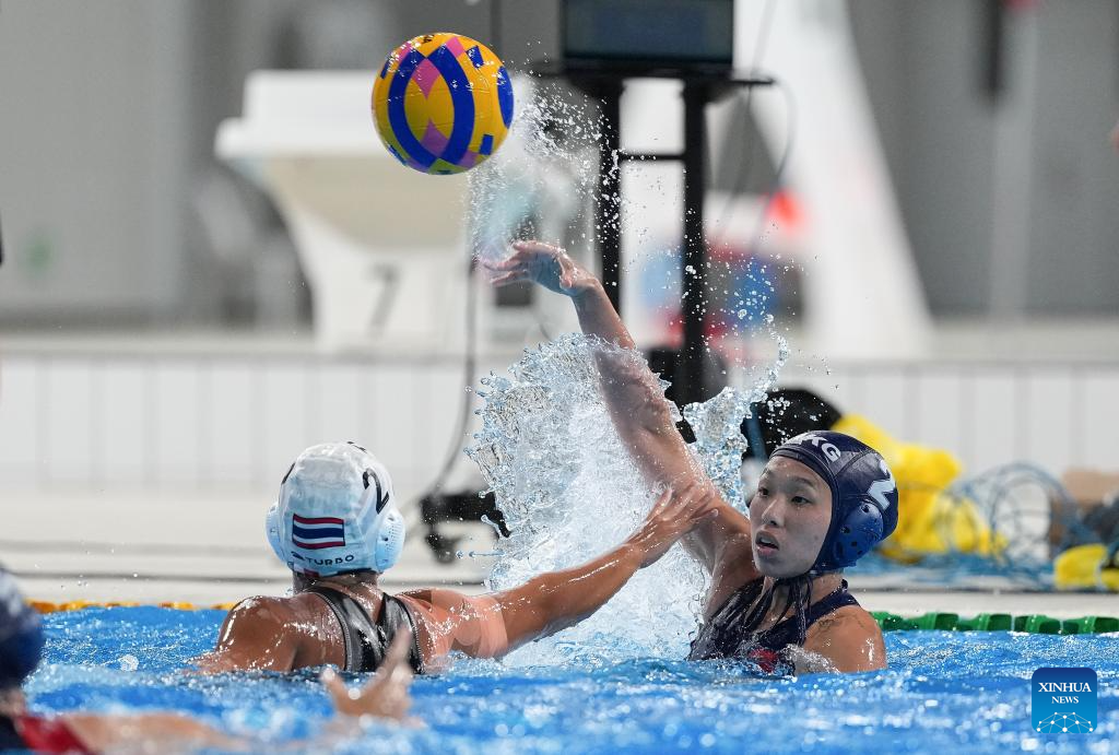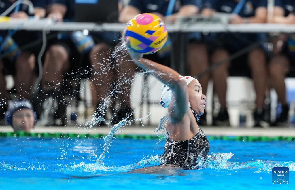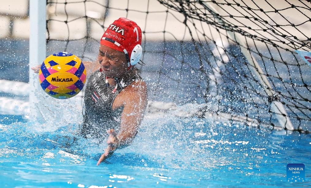 Pimpin Ngamcharoensuktaworn of Thailand competes during the water polo women's round-robin final match between China's Hong Kong and Thailand at the 6th Asian Beach Games in Sanya, south China's Hainan Province, April 24, 2026. (Xinhua/Chen Sihan)