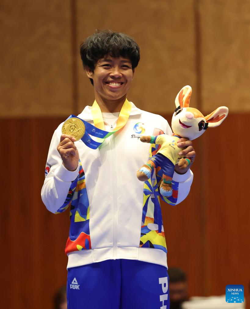 Gold medalist Annie Ramirez of the Philippines poses for photos during the awarding ceremony for Jiu Jitsu women's -57kg at the 6th Asian Beach Games in Sanya, south China's Hainan Province, April 24, 2026. (Photo by Ma Zihan/Xinhua)