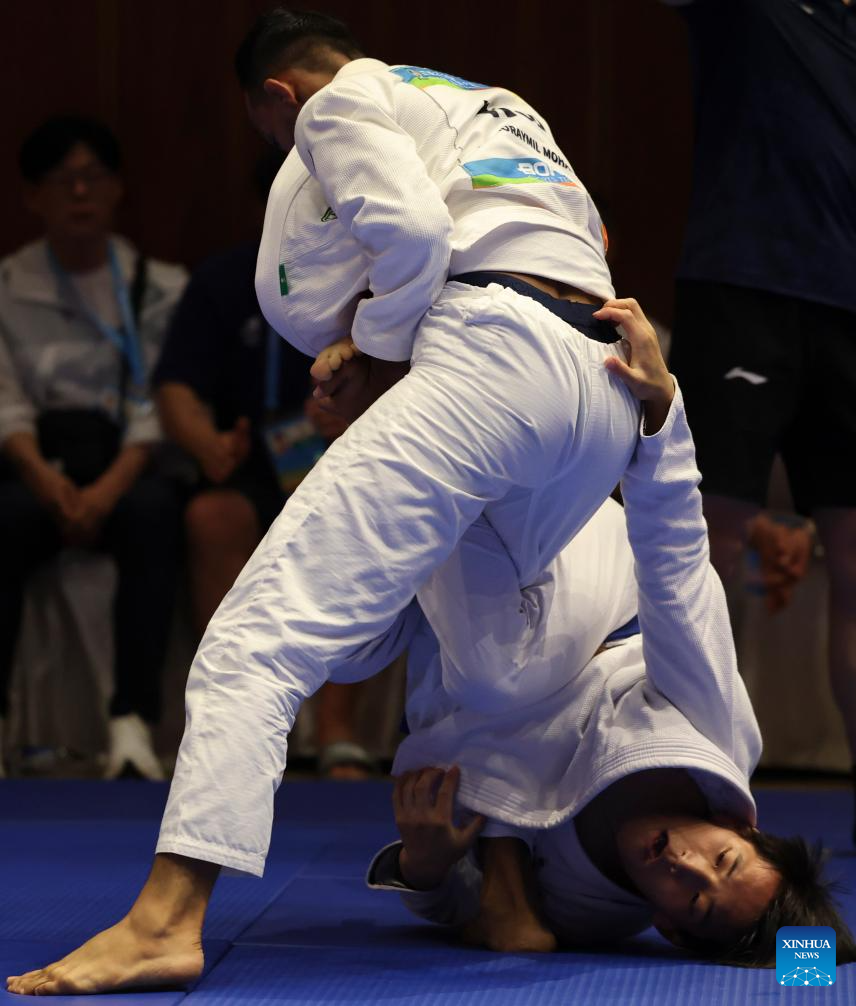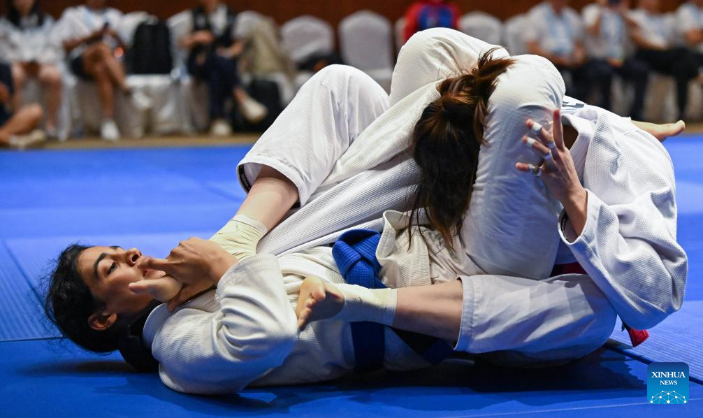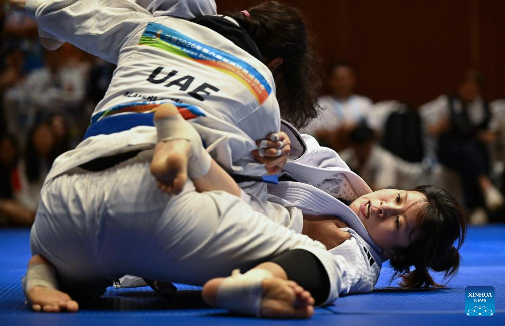 Lee Yujin (R) of South Korea competes with Shamsa Alameri of the United Arab Emirates during their Jiu Jitsu women's -57kg contest for bronze medal at the 6th Asian Beach Games in Sanya, south China's Hainan Province, April 24, 2026. (Xinhua/Bei He)