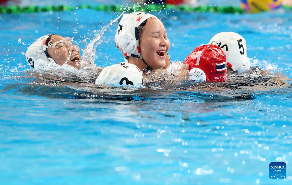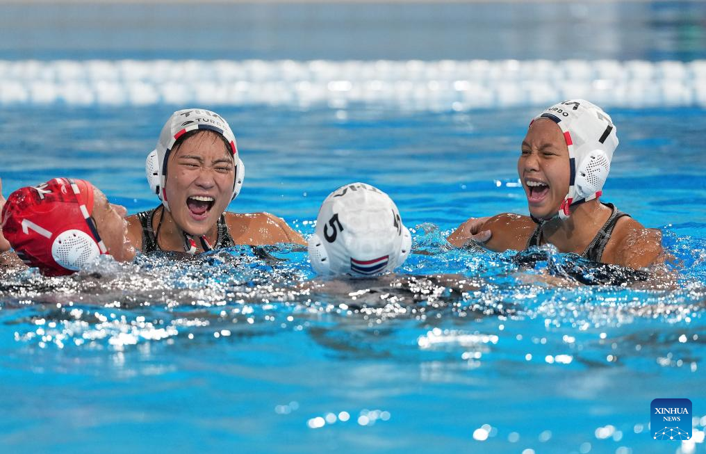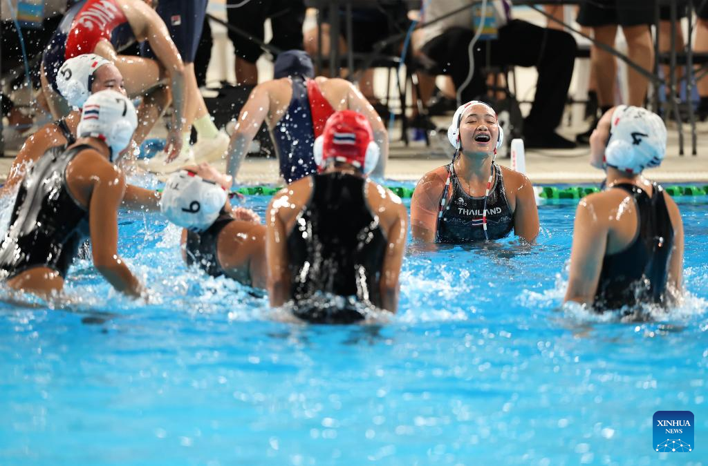 Patrapee Sridee (L) of Thailand celebrates after the water polo women's round-robin final match between China's Hong Kong and Thailand at the 6th Asian Beach Games in Sanya, south China's Hainan Province, April 24, 2026. (Xinhua/Chen Sihan)