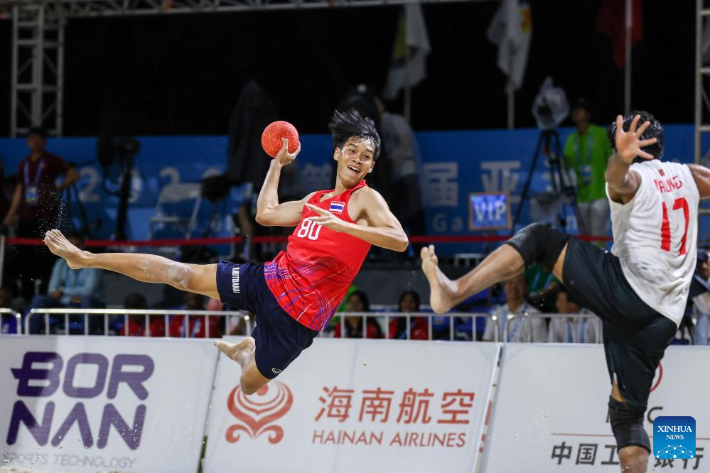 Nutdanai Ruksawong (L) of Thailand competes during the beach handball men's preliminary round group B match between Thailand and Maldives at the 6th Asian Beach Games in Sanya, south China's Hainan Province, April 24, 2026. (Xinhua/Li Bo)