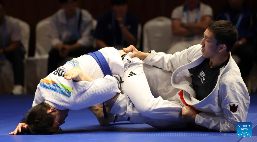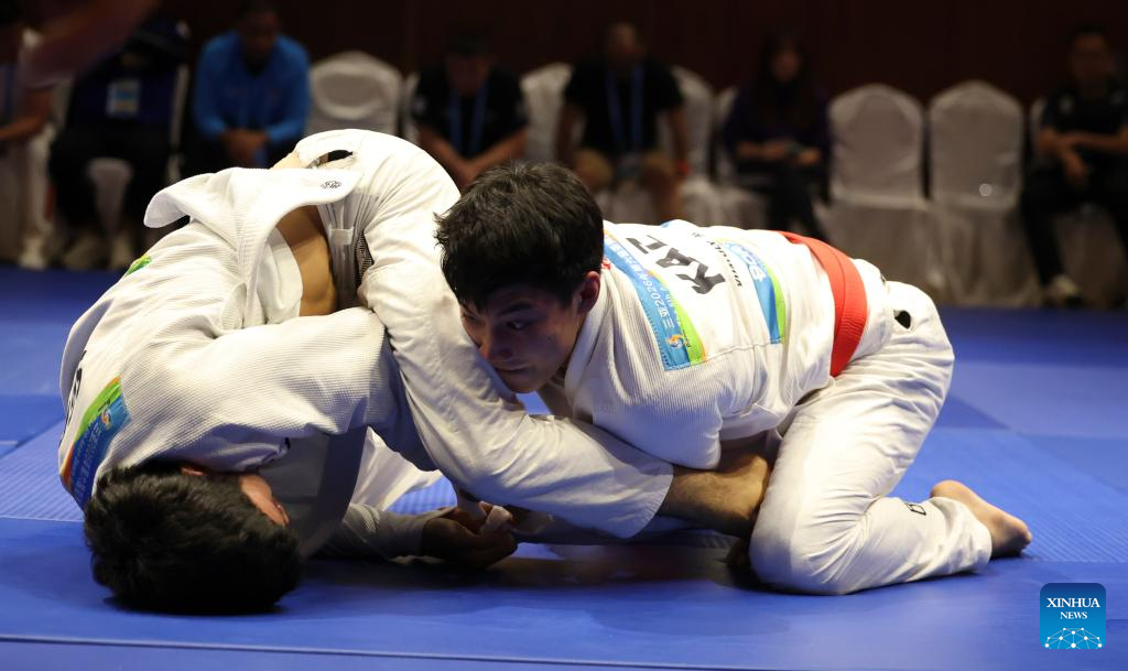 Lim Paul Tian Zhi (R) of Sinapore competes with Seiilkhan Bolatbek of Kazakhstan during their Jiu Jitsu men's -77kg contest for bronze medal at the 6th Asian Beach Games in Sanya, south China's Hainan Province, April 24, 2026. (Xinhua/Bei He)