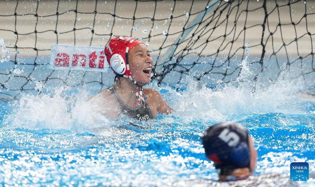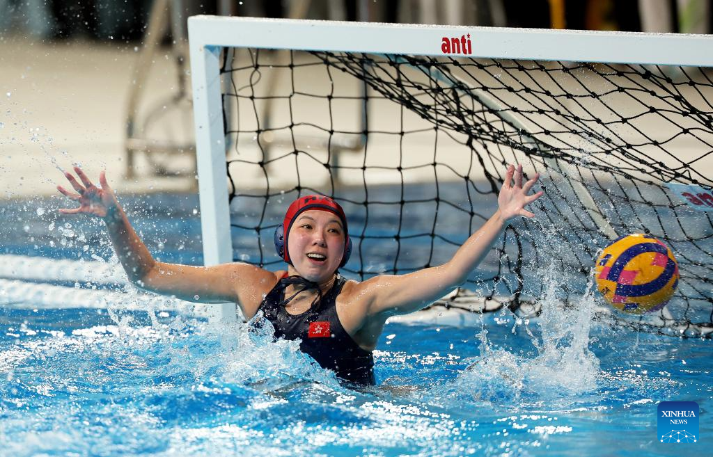 Goalkeeper Li Ho In of China's Hong Kong competes during the water polo women's round-robin final match between China's Hong Kong and Thailand at the 6th Asian Beach Games in Sanya, south China's Hainan Province, April 24, 2026. (Xinhua/Zhu Weixi)