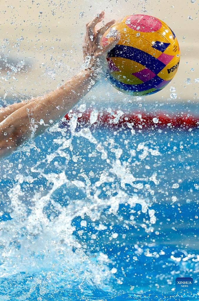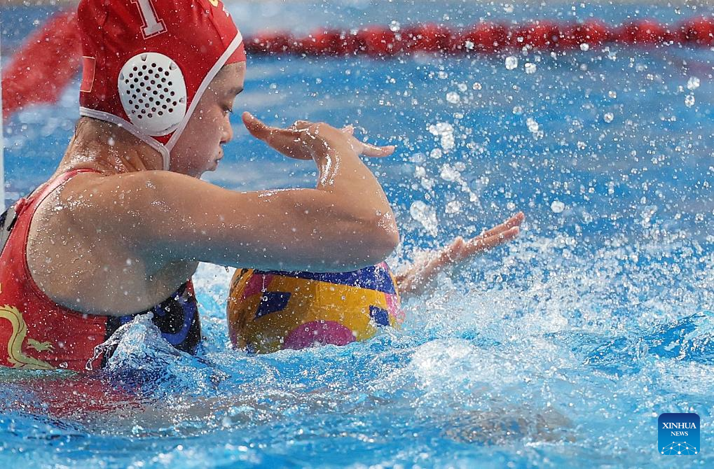 Ding Yinghua of China competes during the water polo women's round-robin final match between China and Kazakhstan at the 6th Asian Beach Games in Sanya, south China's Hainan Province, April 24, 2026. (Xinhua/Chen Sihan)