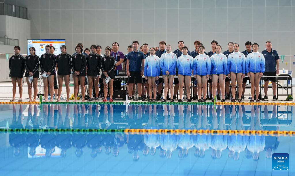 Players, coaches and staff members line up before the water polo women's round-robin final match between China's Hong Kong and Thailand at the 6th Asian Beach Games in Sanya, south China's Hainan Province, April 24, 2026. (Xinhua/Chen Sihan)