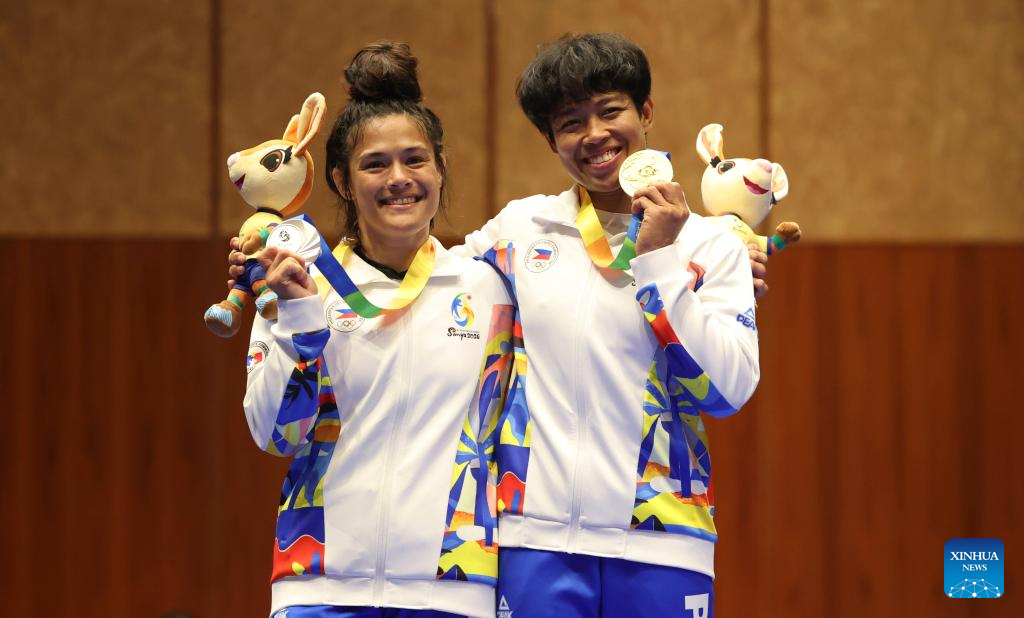 Gold medalist Annie Ramirez (R) of the Philippines and silver medalist Emily Rosalynn Thomas of the Philippines pose for photos during the awarding ceremony for Jiu Jitsu women's -57kg at the 6th Asian Beach Games in Sanya, south China's Hainan Province, April 24, 2026. (Photo by Ma Zihan/Xinhua)