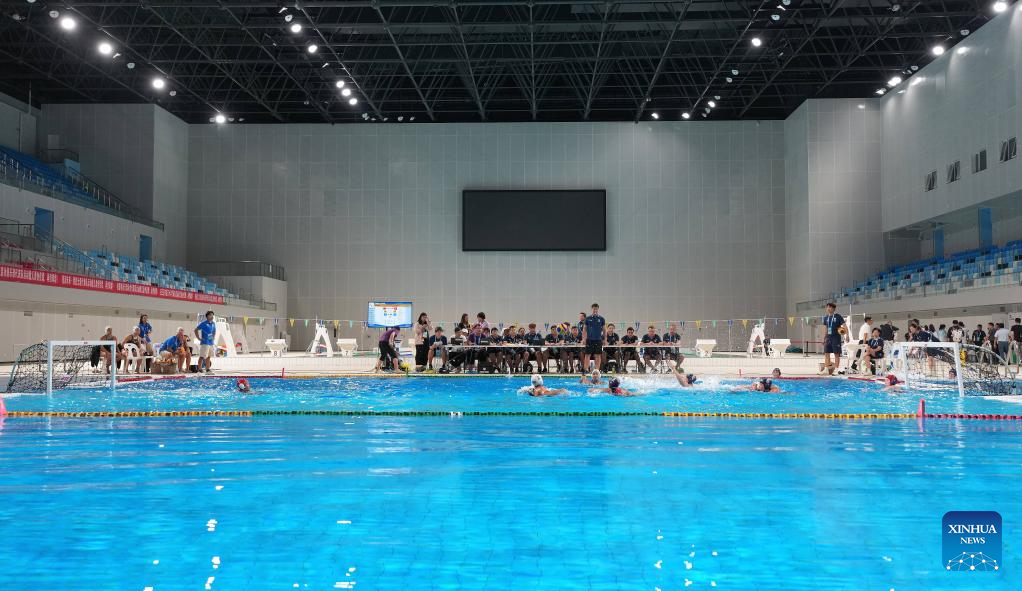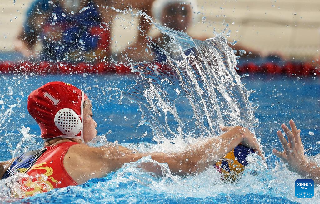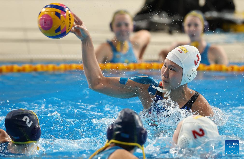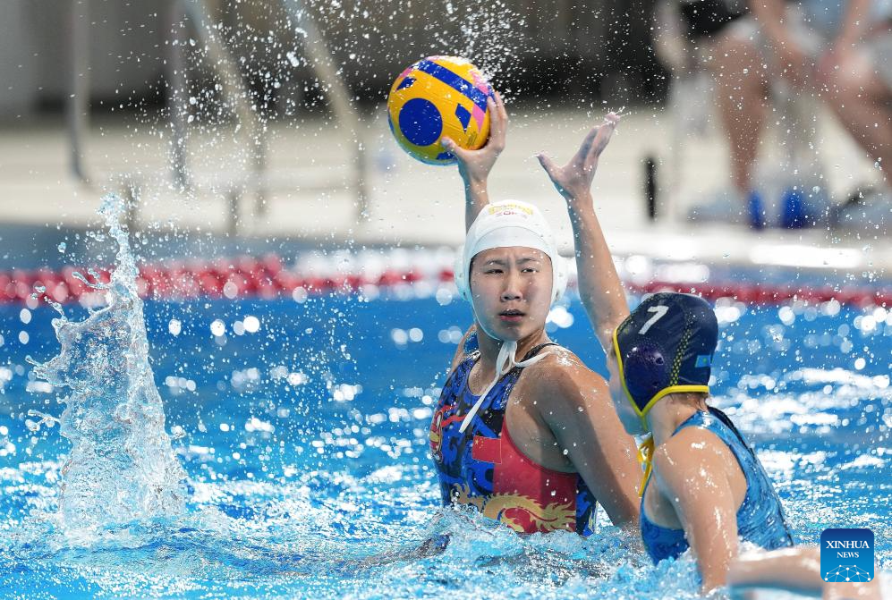 Ding Yinghua of China competes during the water polo women's round-robin final match between China and Kazakhstan at the 6th Asian Beach Games in Sanya, south China's Hainan Province, April 24, 2026. (Xinhua/Zhu Weixi)