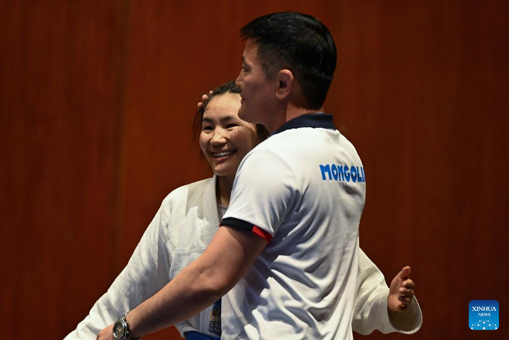 Shurentsetseg Ehnkhmunkh (L) of Mongolia celebrates with her coach after defeating Aksarapak Sirimak of Thailand during the Jiu Jitsu women's -57kg contest for bronze medal at the 6th Asian Beach Games in Sanya, south China's Hainan Province, April 24, 2026. (Xinhua/Bei He)
