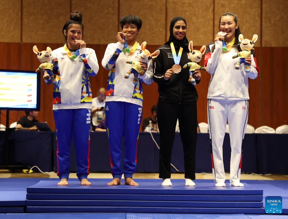 Gold medalist Annie Ramirez (2nd L) of the Philippines, silver medalist Emily Rosalynn Thomas (1st L) of the Philippines, bronze medalists Shamsa Alameri (2nd R) of the United Arab Emirates and Shurentsetseg Ehnkhmunkh of Mongolia pose for photos during the awarding ceremony for Jiu Jitsu women's -57kg at the 6th Asian Beach Games in Sanya, south China's Hainan Province, April 24, 2026. (Photo by Ma Zihan/Xinhua)