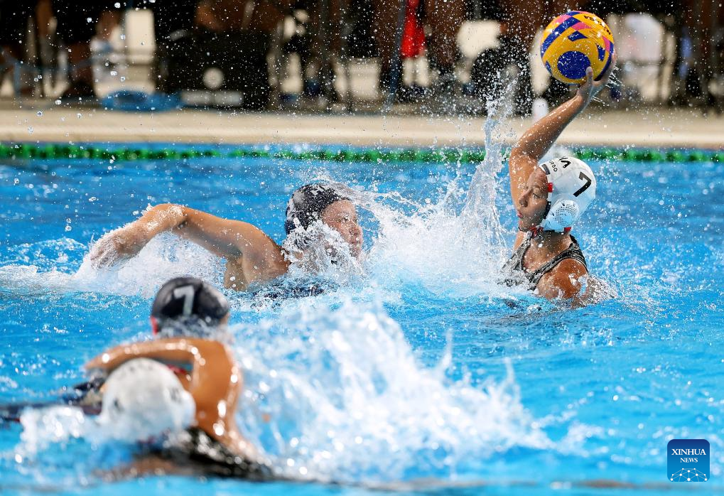 Ng Hau Laam Fran (R) of China's Hong Kong competes during the water polo women's round-robin final match between China's Hong Kong and Thailand at the 6th Asian Beach Games in Sanya, south China's Hainan Province, April 24, 2026. (Xinhua/Chen Sihan)