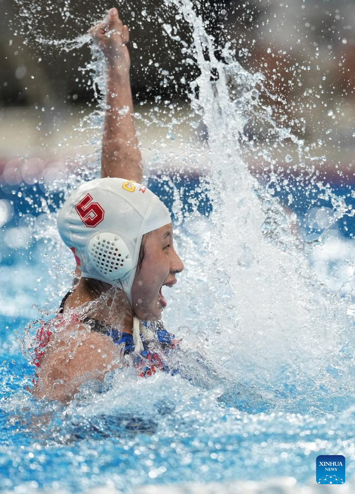 Ding Yinghua of China celebrates during the water polo women's round-robin final match between China and Kazakhstan at the 6th Asian Beach Games in Sanya, south China's Hainan Province, April 24, 2026. (Xinhua/Chen Sihan)