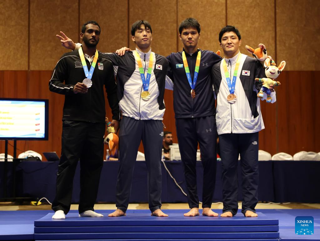 Gold medalist Park Jaewoon (2nd L) of South Korea, silver medalist Mahdi Alawlaqi (1st L) of the United Arab Emirates, bronze medalists Seiilkhan Bolatbek (2nd R) of Kazakhstan and Koo Boncheol of South Korea pose for photos during the awarding ceremony for Jiu Jitsu men's -77kg at the 6th Asian Beach Games in Sanya, south China's Hainan Province, April 24, 2026. (Photo by Ma Zihan/Xinhua)