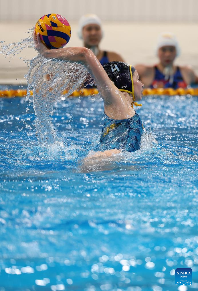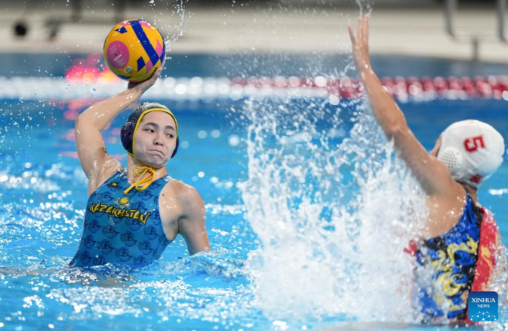Taira Mukhayeva of Kazakhstan competes during the water polo women's round-robin final match between China and Kazakhstan at the 6th Asian Beach Games in Sanya, south China's Hainan Province, April 24, 2026. (Xinhua/Zhu Weixi)