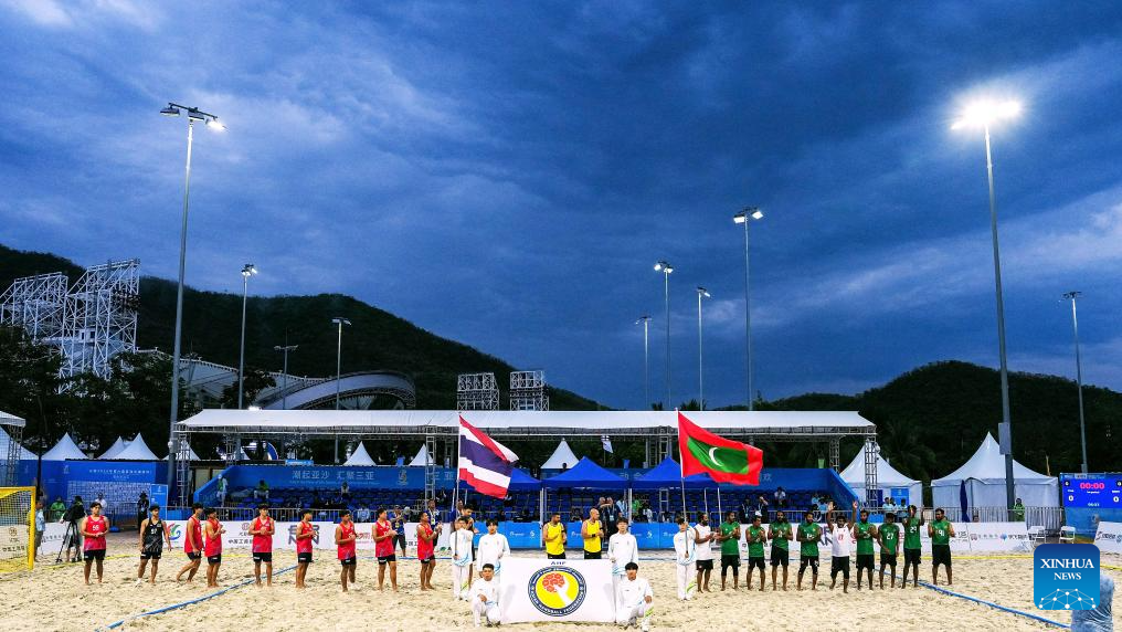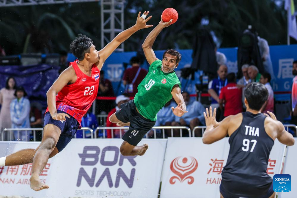 Fathuhulla Adam (C) of Maldives competes during the beach handball men's preliminary round group B match between Thailand and Maldives at the 6th Asian Beach Games in Sanya, south China's Hainan Province, April 24, 2026. (Xinhua/Li Bo)
