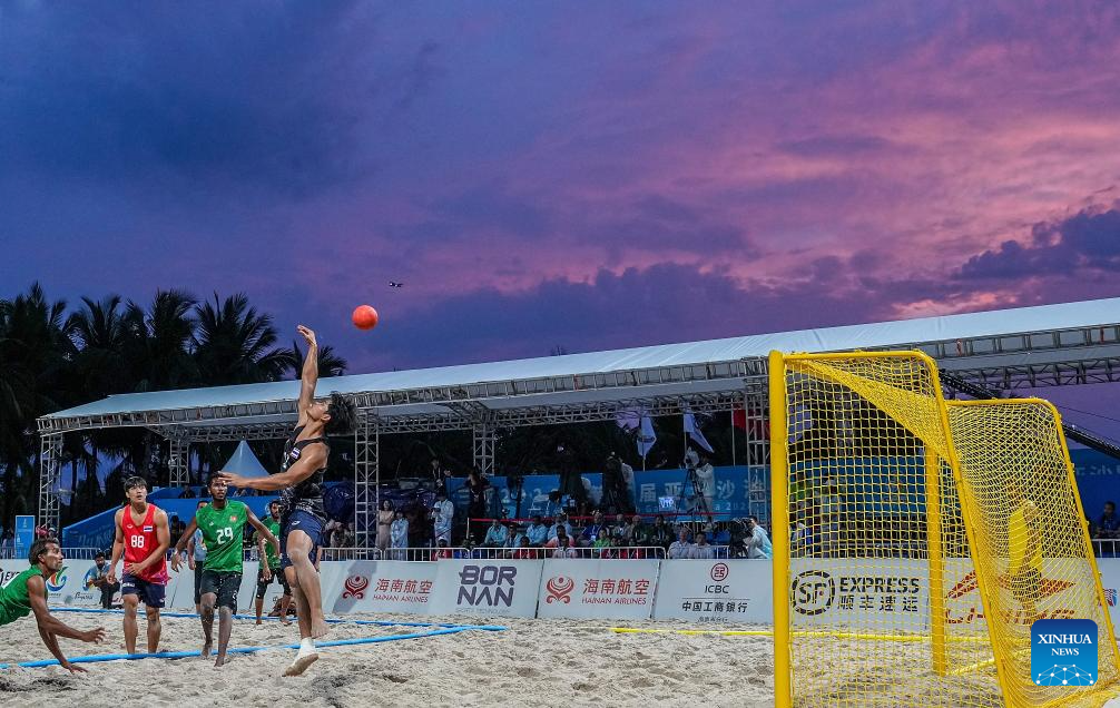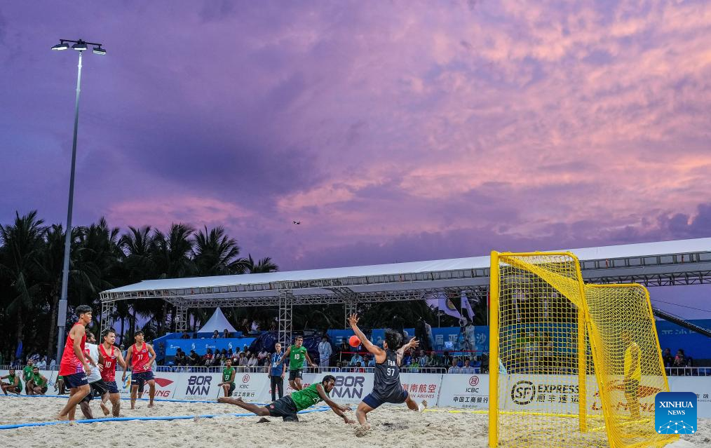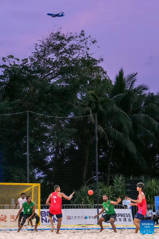 Players of both sides compete during the beach handball men's preliminary round group B match between Thailand and Maldives at the 6th Asian Beach Games in Sanya, south China's Hainan Province, April 24, 2026. (Xinhua/Li Bo)