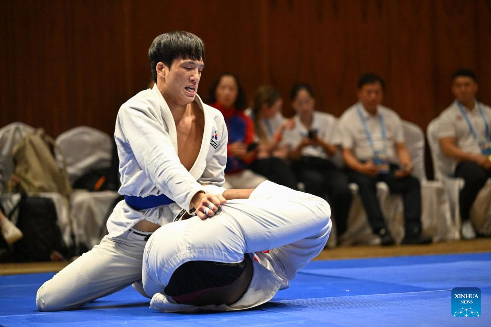 Nurzhan Batyrbekov (L) of Kazakhstan competes with Lee Jaeyoung of South Korea during their Jiu Jitsu men's -69kg contest for gold medal at the 6th Asian Beach Games in Sanya, south China's Hainan Province, April 24, 2026. (Photo by Ma Zihan/Xinhua)
