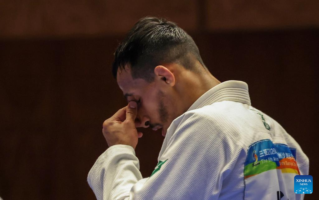 Mohammed bin Huraymil of Saudi Arabia reacts after the Jiu Jitsu men's -69kg contest for bronze medal between Mohammed bin Huraymil of Saudi Arabia and Joo Seonghyeon of South Korea at the 6th Asian Beach Games in Sanya, south China's Hainan Province, April 24, 2026. (Photo by Ma Zihan/Xinhua)