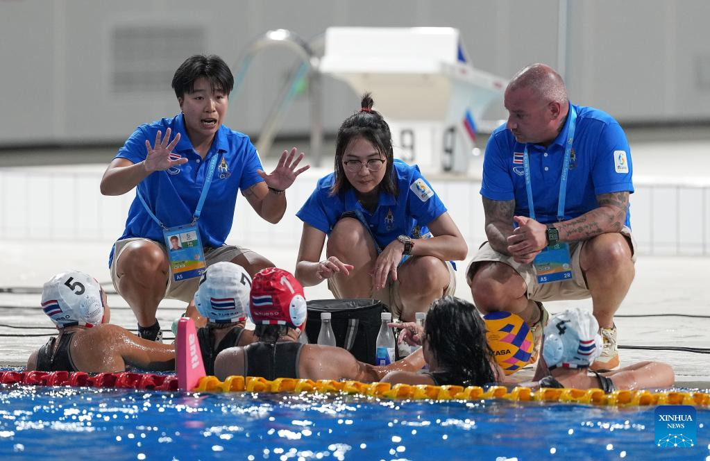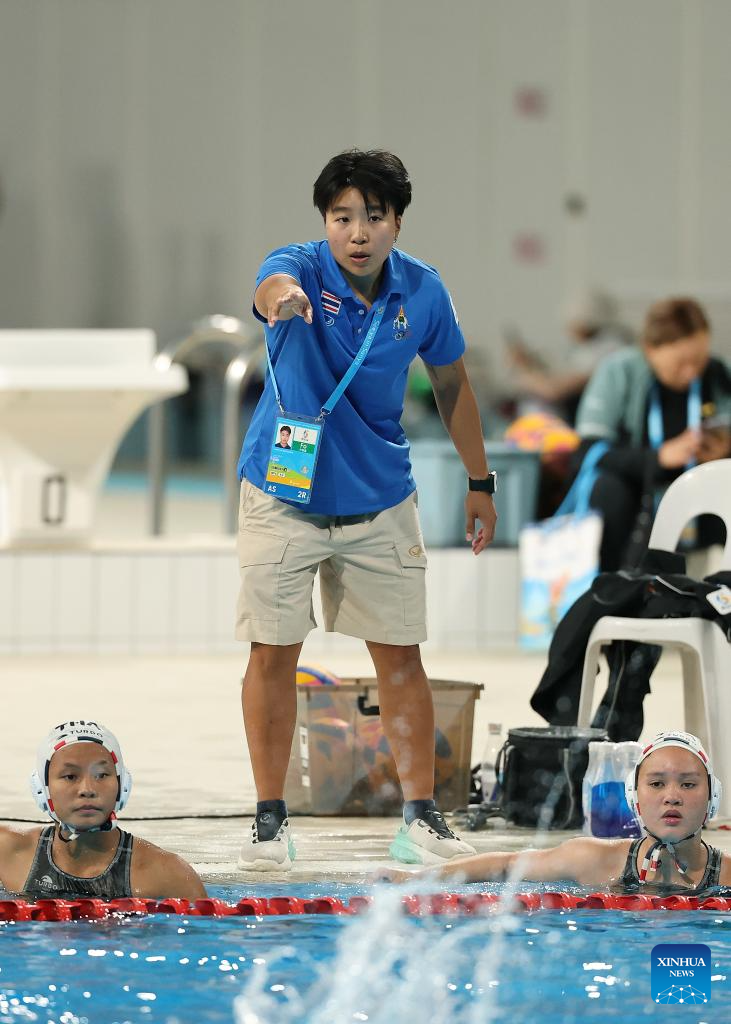 Sarocha Rewrujirek (C), head coach of Thailand, instructs players during the water polo women's round-robin final match between China's Hong Kong and Thailand at the 6th Asian Beach Games in Sanya, south China's Hainan Province, April 24, 2026. (Xinhua/Zhu Weixi)