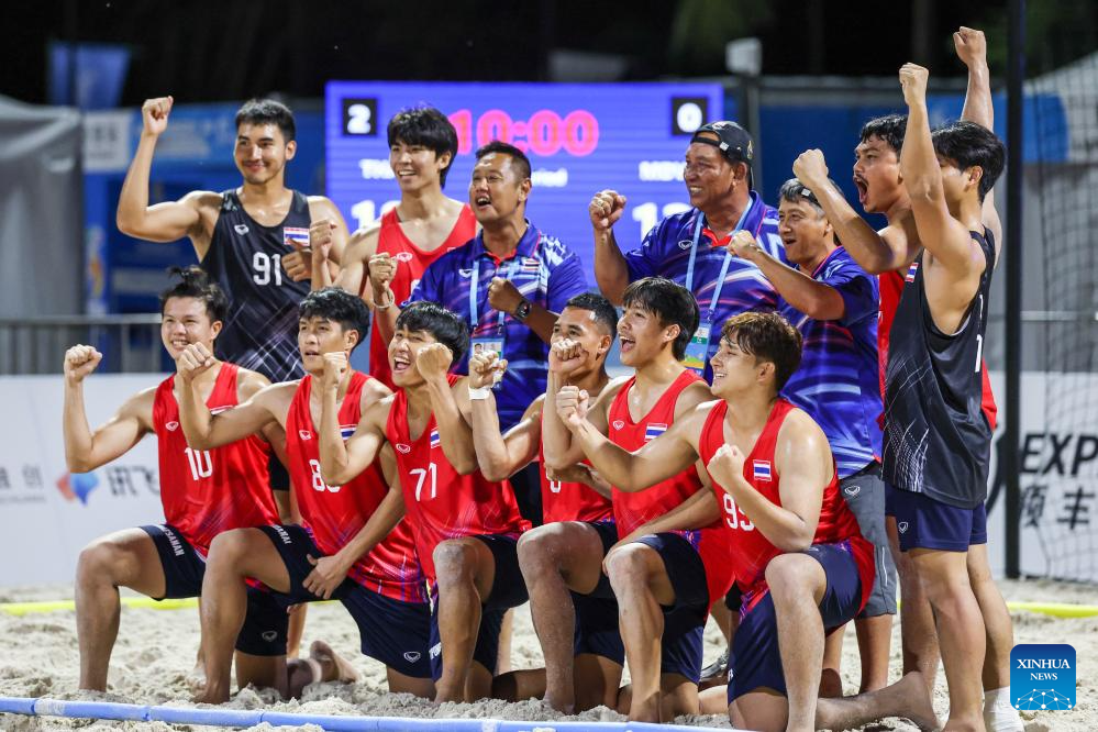 Members of Thailand react after the beach handball men's preliminary round group B match between Thailand and Maldives at the 6th Asian Beach Games in Sanya, south China's Hainan Province, April 24, 2026. (Xinhua/Li Bo)