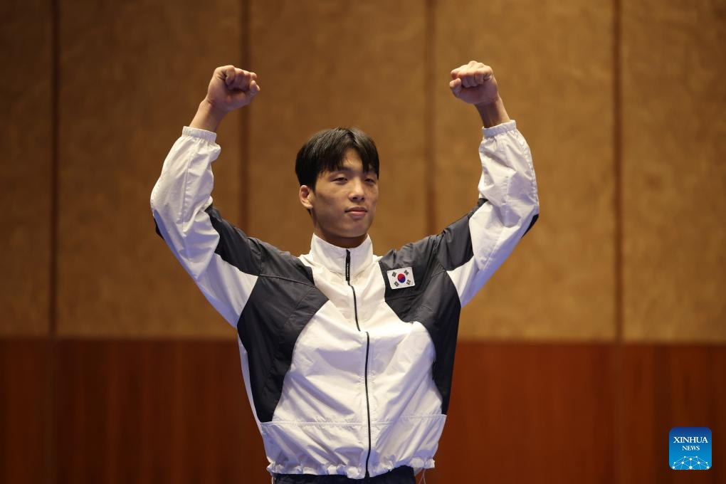 Gold medalist Park Jaewoon of South Korea celebrates during the awarding ceremony for Jiu Jitsu men's -77kg at the 6th Asian Beach Games in Sanya, south China's Hainan Province, April 24, 2026. (Photo by Ma Zihan/Xinhua)