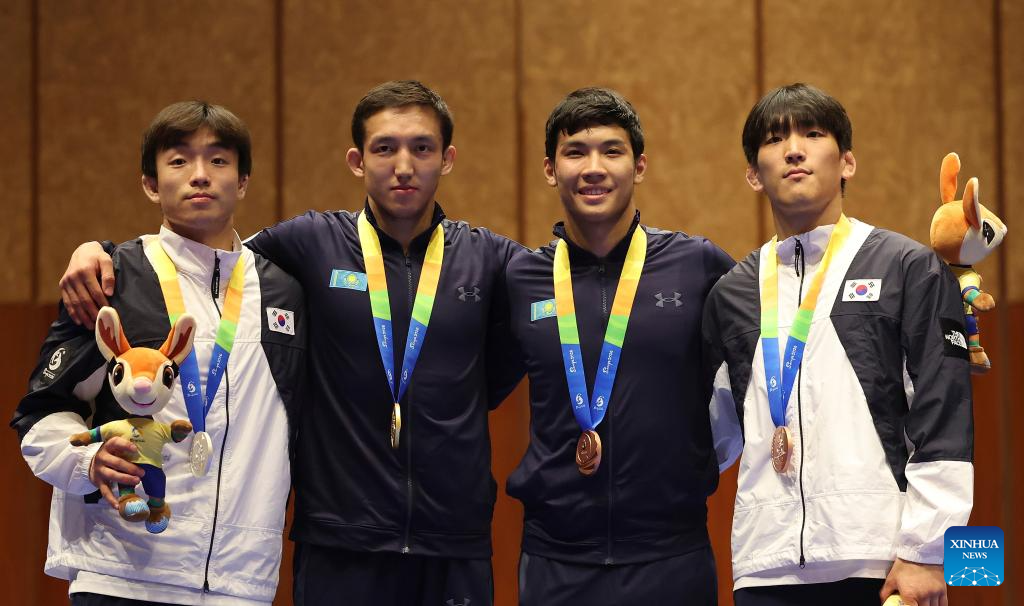 Gold medalist of Nurzhan Batyrbekov (2nd L) of Kazakhstan, silver medalist Lee Jaeyoung (1st L) of South Korea, bronze medalists Alinur Kuatuly of Kazakhstan (2nd R) and Joo Seonghyeon of South Korea pose for photos during the awarding ceremony for Jiu Jitsu men's -69kg at the 6th Asian Beach Games in Sanya, south China's Hainan Province, April 24, 2026. (Photo by Ma Zihan/Xinhua)
