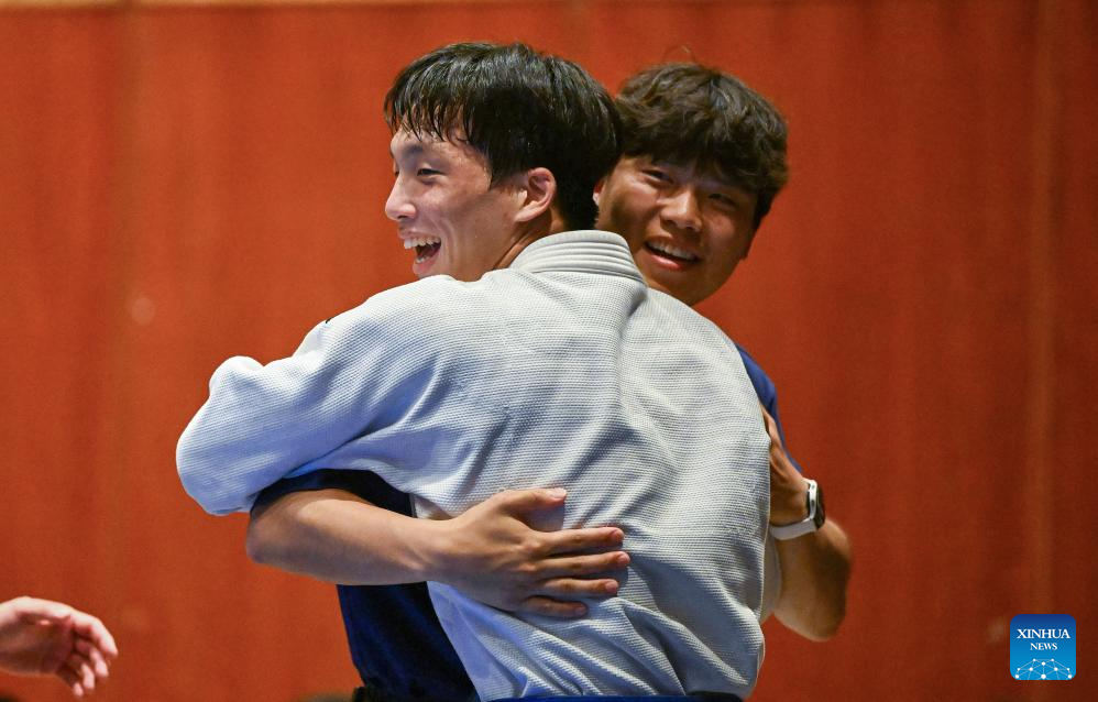 Park Jaewoon (L) of South Korea celebrates with his coach after defeating Mahdi Alawlaqi of the United Arab Emirates during the Jiu Jitsu men's -77kg gold medal contest at the 6th Asian Beach Games in Sanya, south China's Hainan Province, April 24, 2026. (Xinhua/Bei He)