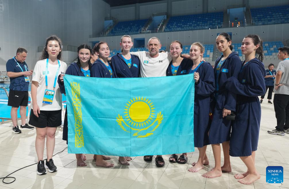 Members of Team Kazakhstan pose after the water polo women's round-robin final match between China and Kazakhstan at the 6th Asian Beach Games in Sanya, south China's Hainan Province, April 24, 2026. (Xinhua/Chen Sihan)