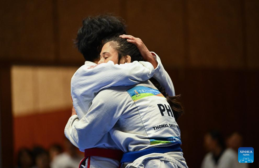 Annie Ramirez (L) of the Philippines hugs Emily Rosalynn Thomas of the Philippines after their Jiu Jitsu women's -57kg gold medal contest at the 6th Asian Beach Games in Sanya, south China's Hainan Province, April 24, 2026. (Xinhua/Bei He)