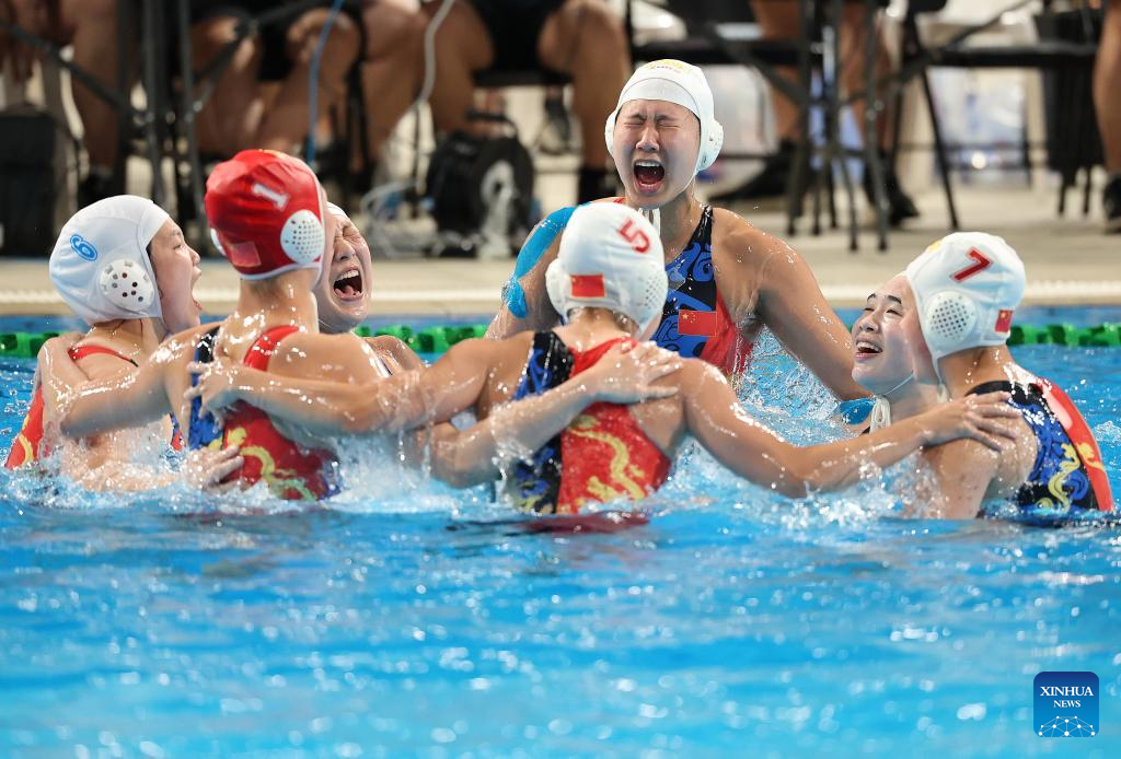 Players of China celebrate after the water polo women's round-robin final match between China and Kazakhstan at the 6th Asian Beach Games in Sanya, south China's Hainan Province, April 24, 2026. (Xinhua/Chen Sihan)