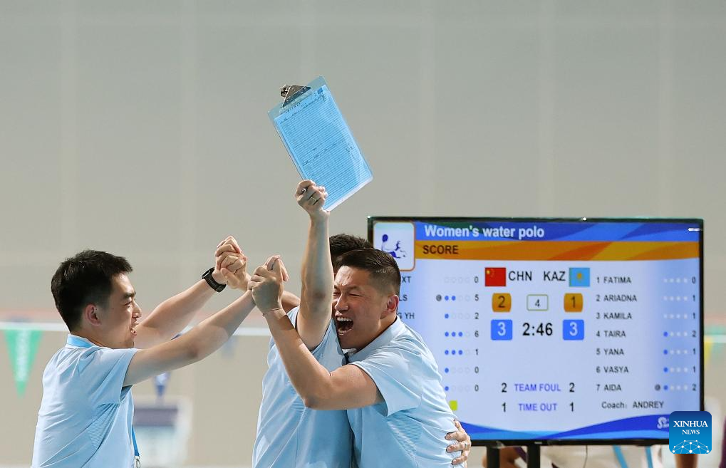 Coaches of China celebrate after the water polo women's round-robin final match between China and Kazakhstan at the 6th Asian Beach Games in Sanya, south China's Hainan Province, April 24, 2026. (Xinhua/Zhu Weixi)