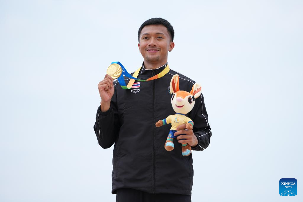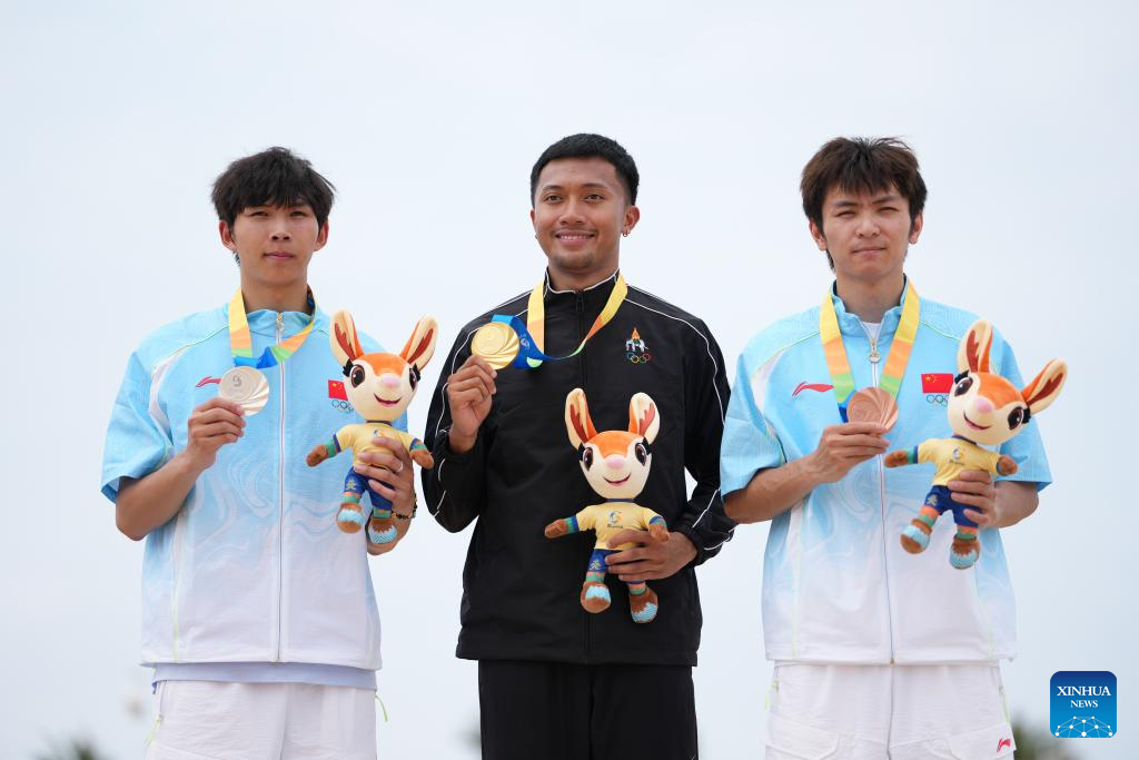 Gold medalist Puripol Boonson fo Thailand poses for photos during the awarding ceremony of the men's 60m of beach athletics at the 6th Asian Beach Games in Sanya, south China's Hainan Province, April 25, 2026. (Xinhua/Pan Yulong)