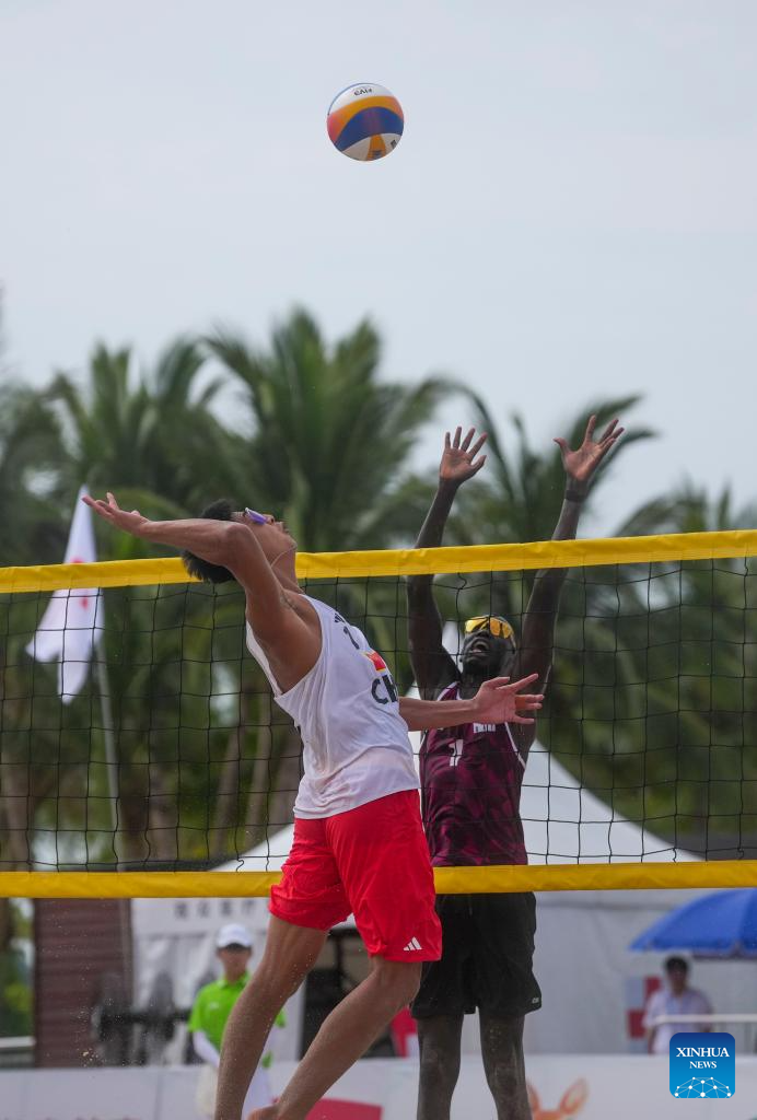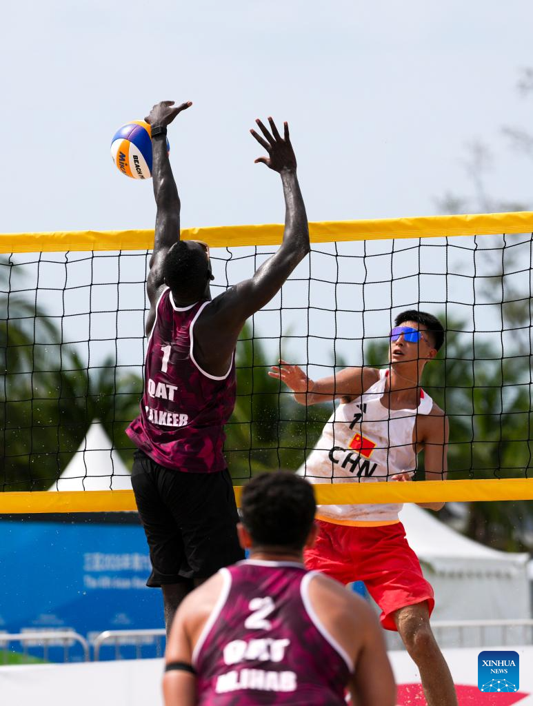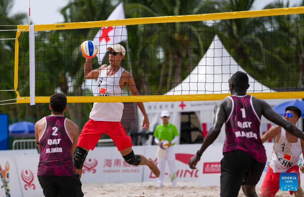 Wu Jiaxin (top) of China competes during the beach volleyball men's preliminary pool A match between Wang Yanwei/Wu Jiaxin of China and Musa Alkeer Mou/Mohamed Zakinelabedin of Qatar at the 6th Asian Beach Games in Sanya, south China's Hainan Province, April 25, 2026. (Xinhua/Jigme Dorje)