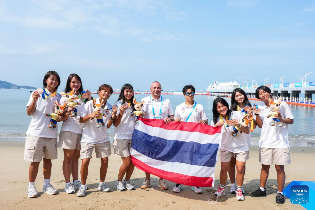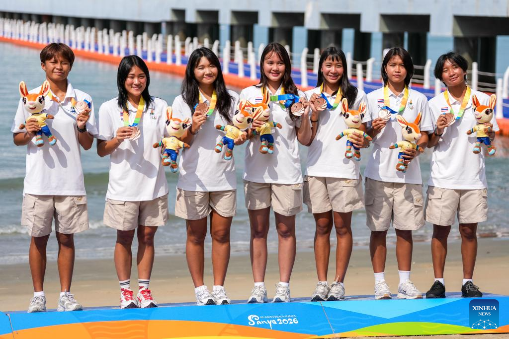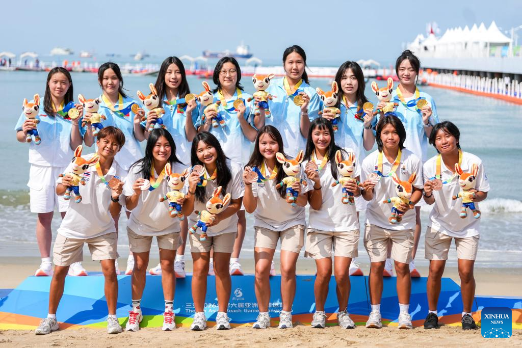 Bronze medalists team Thailand pose for photos during the awarding ceremony of the women's water polo event at the 6th Asian Beach Games in Sanya, south China's Hainan Province, April 25, 2026. (Xinhua/Chen Sihan)
