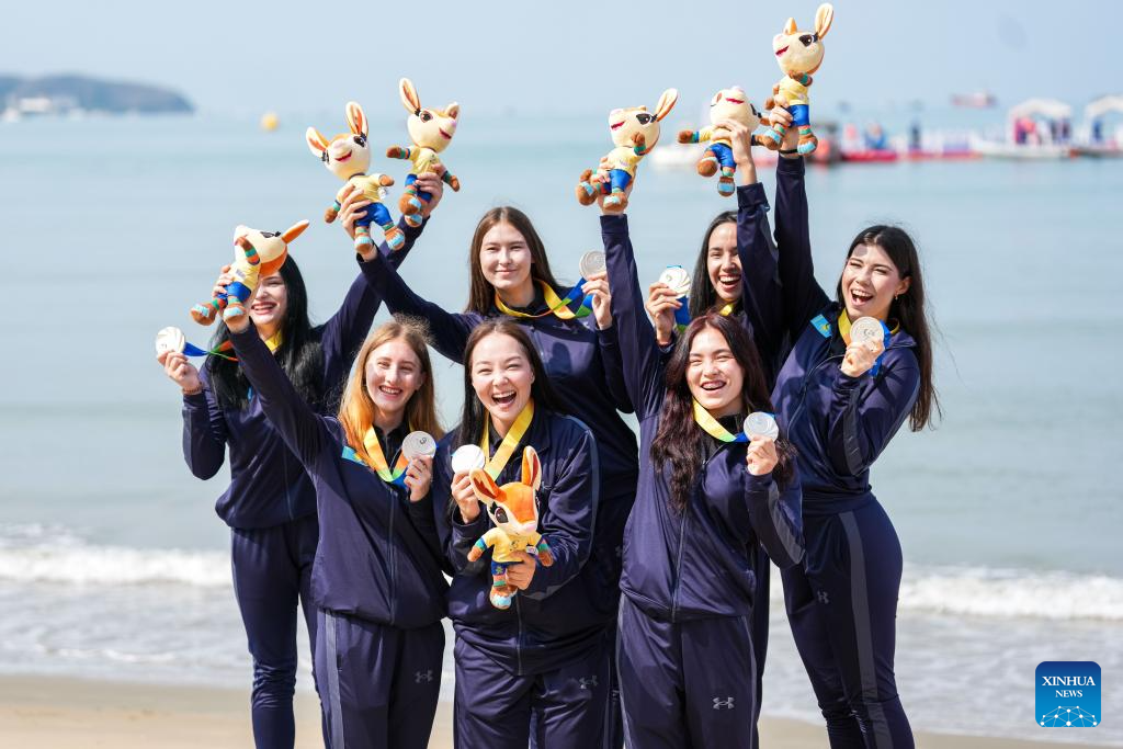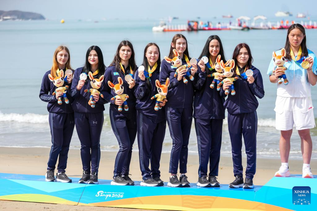 Silver medalists team Kazakhstan pose for photos during the awarding ceremony of the women's water polo event at the 6th Asian Beach Games in Sanya, south China's Hainan Province, April 25, 2026. (Xinhua/Chen Sihan)
