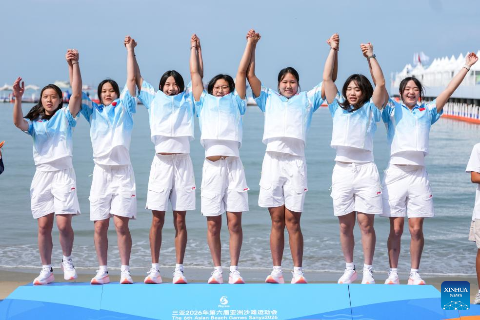 Gold medalists team China pose for photos during the awarding ceremony of the women's water polo event at the 6th Asian Beach Games in Sanya, south China's Hainan Province, April 25, 2026. (Xinhua/Chen Sihan)