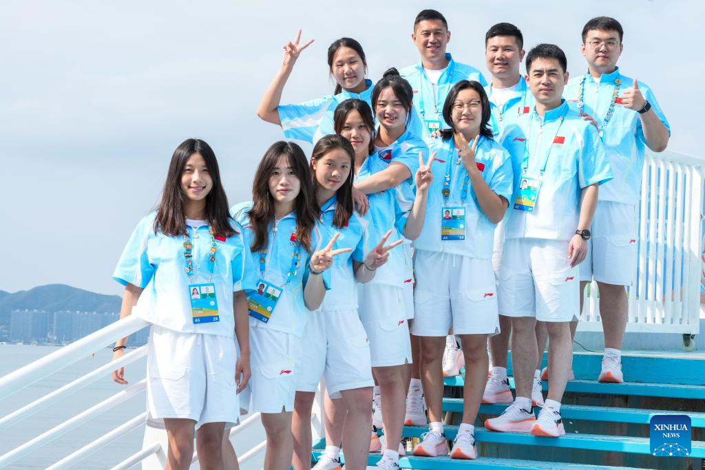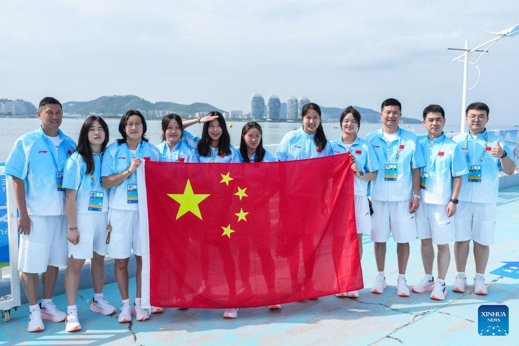 Players and coaches of team China pose for photos before the awarding ceremony of the women's water polo event at the 6th Asian Beach Games in Sanya, south China's Hainan Province, April 25, 2026. (Xinhua/Chen Sihan)