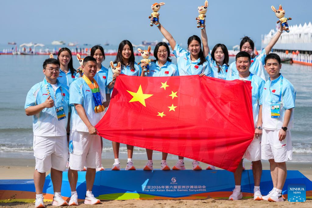 Gold medalists players and coaches of team China pose for photos during the awarding ceremony of the women's water polo event at the 6th Asian Beach Games in Sanya, south China's Hainan Province, April 25, 2026. (Xinhua/Chen Sihan)