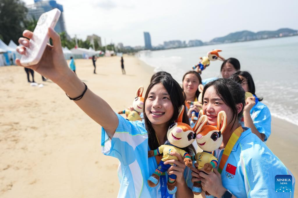Gold medalists players of team China take selfies after the awarding ceremony of the women's water polo event at the 6th Asian Beach Games in Sanya, south China's Hainan Province, April 25, 2026. (Xinhua/Chen Sihan)