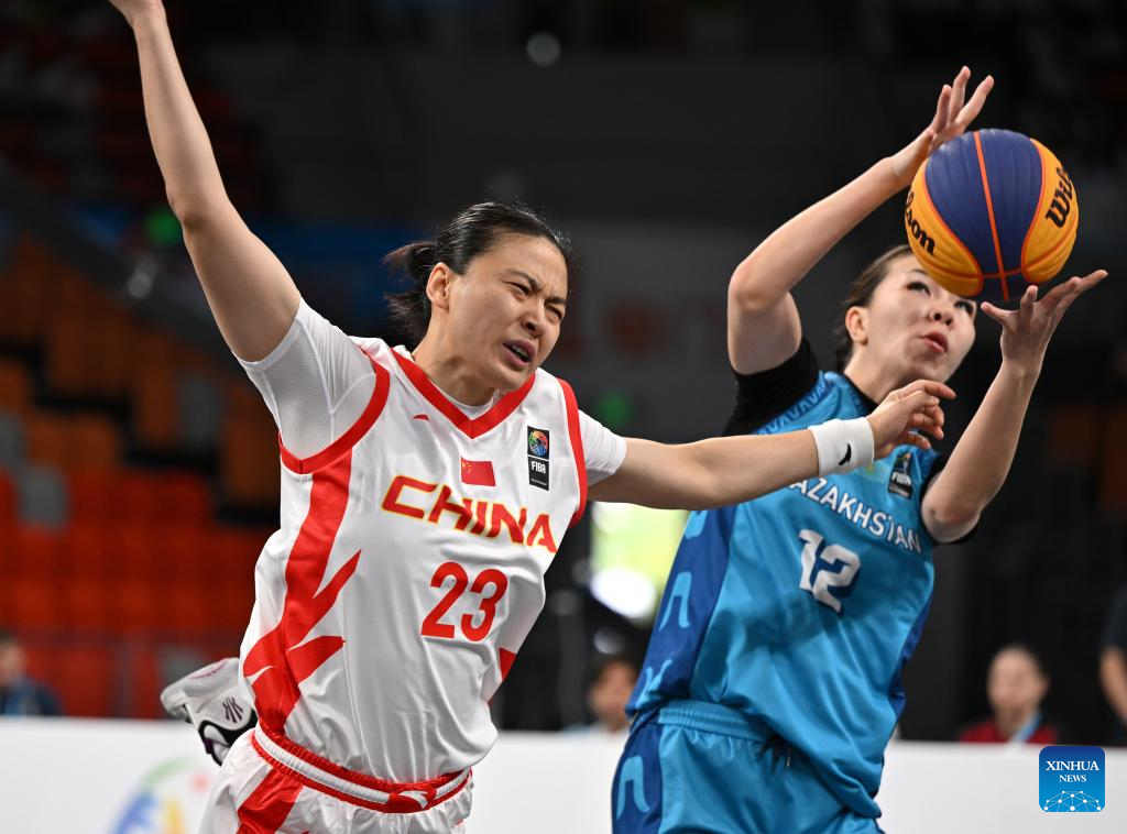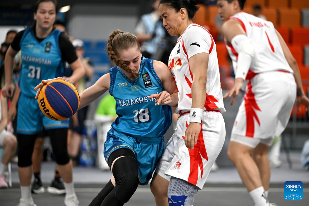 Liya Umerova (L, front) of Kazakhstan breaks through during the 3x3 basketball women's group A match between China and Kazakhstan at the 6th Asian Beach Games in Sanya, south China's Hainan Province, April 25, 2026. (Xinhua/Guo Cheng)