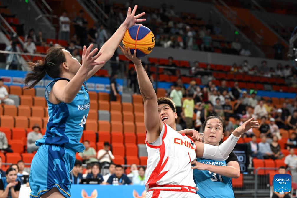Yang Hengyu (C) of China competes during the 3x3 basketball women's group A match between China and Kazakhstan at the 6th Asian Beach Games in Sanya, south China's Hainan Province, April 25, 2026. (Xinhua/Guo Cheng)