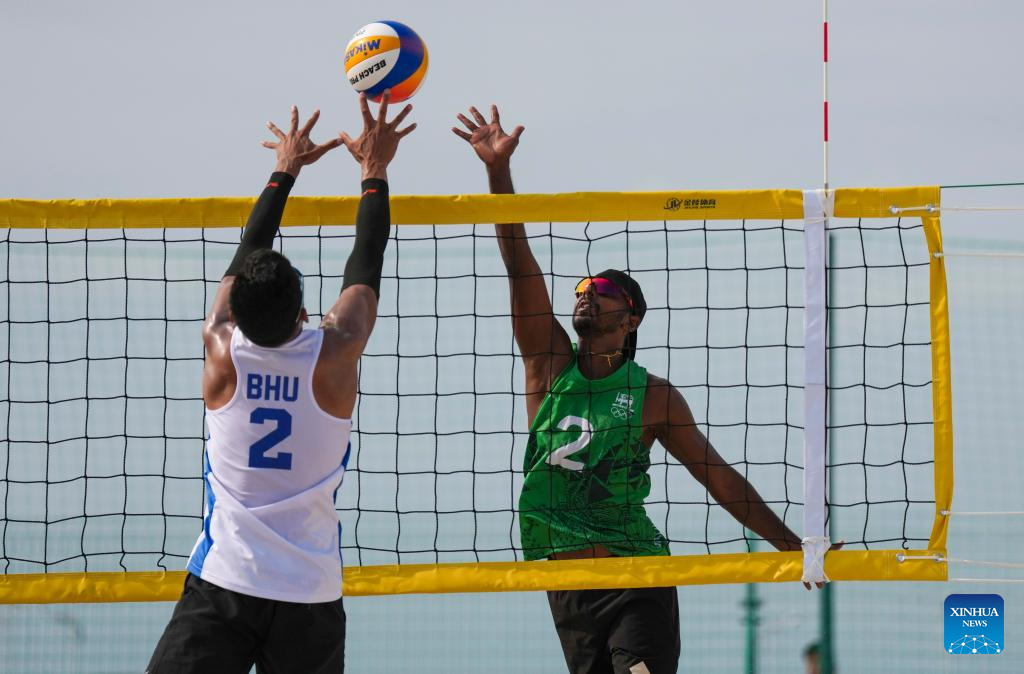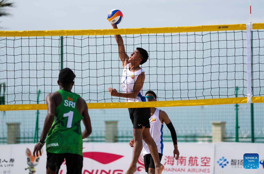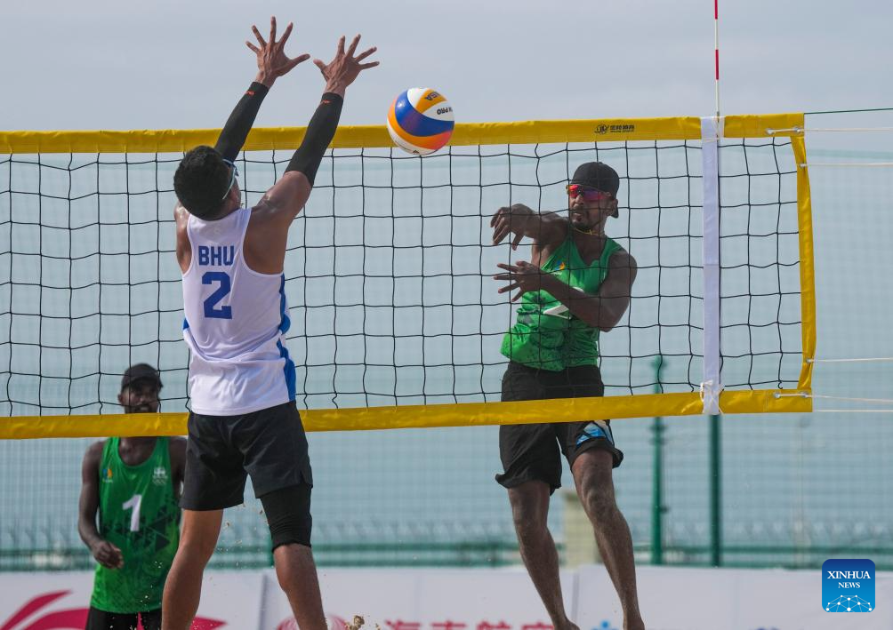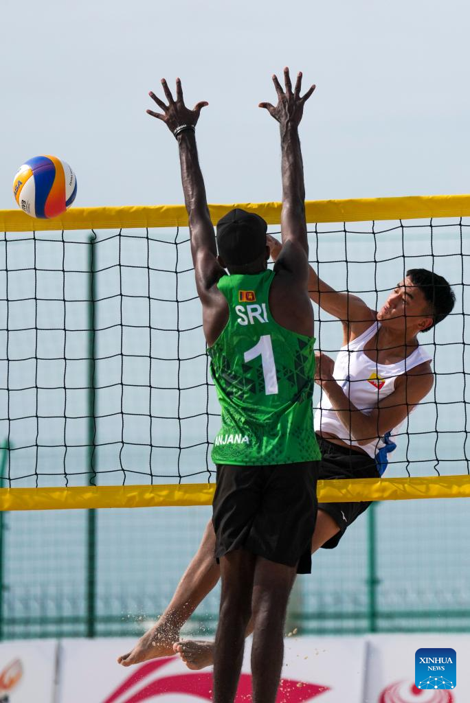 Jurme Rangdal (R) of Bhutan competes during the beach volleyball men's preliminary pool G match between A Manikkuhewage/Sadun Madusanka Farnando Andibuduge of Sri Lanka and Jurme Rangdal/Tshering Dorji of Bhutan at the 6th Asian Beach Games in Sanya, south China's Hainan Province, April 25, 2026. (Xinhua/Jigme Dorje)